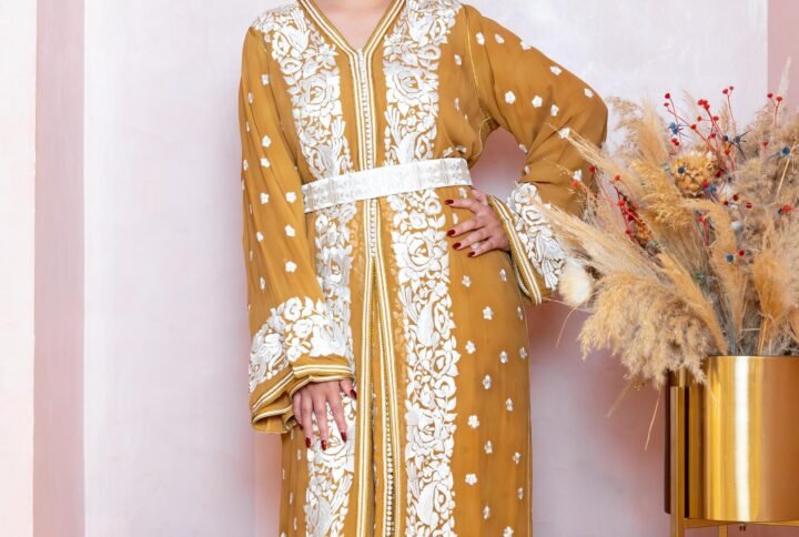 Le Caftan Bleu Sarcelle Doré Classique est une ode à la délicatesse et au charme traditionnel du caftan marocain. Sa coupe droite et fluide met en valeur la silhouette avec élégance, tandis que la broderie dorée qui longe tout le devant apporte une touche de noblesse discrète.