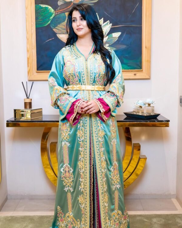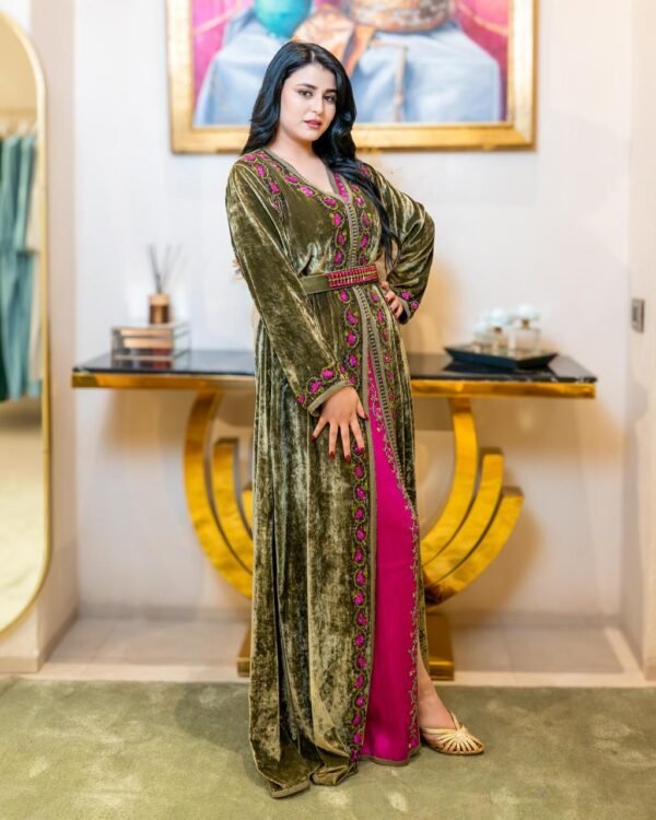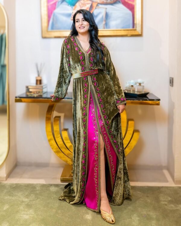 Le Caftan Léopard Chic Rosé Doré mêle modernité et tradition avec originalité. Son tissu léger à imprimé léopard rose et noir apporte une touche contemporaine et dynamique, tandis que les broderies dorées sur le buste et les manches rappellent le raffinement de l’artisanat marocain.