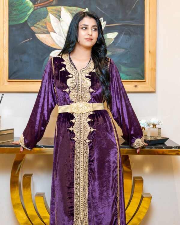 Ce caftan se distingue par son tissu texturé à l’imprimé léopard, alliant différentes nuances de brun, beige et noir pour un rendu sauvage et élégant.