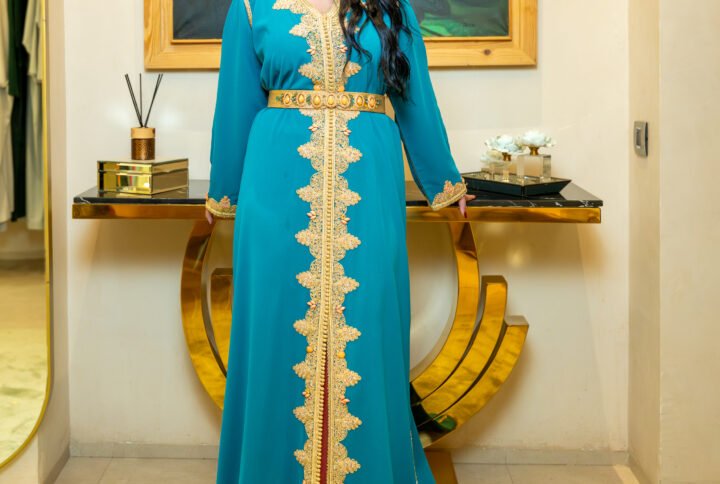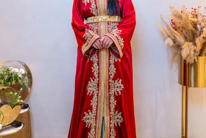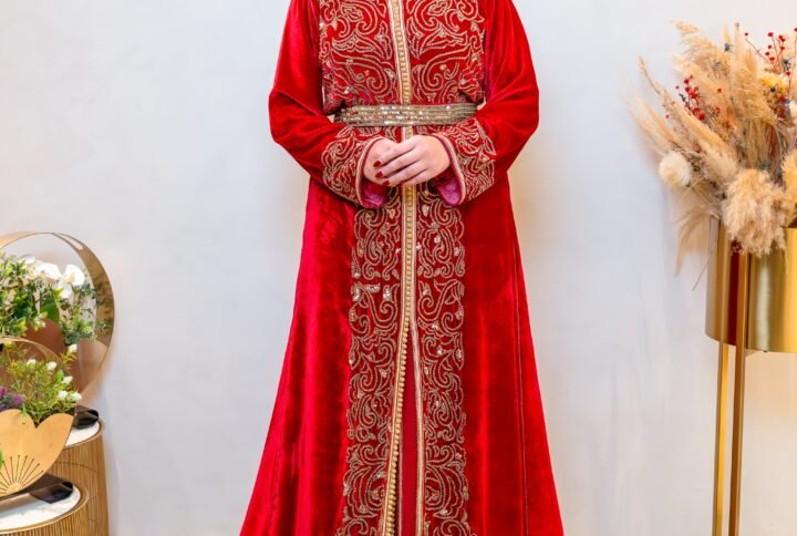 Le Caftan Velours Rouge Royal Doré incarne le raffinement et la noblesse des tenues traditionnelles marocaines. Taillé dans un somptueux velours rouge, il est magnifiquement orné de broderies dorées à motifs floraux et géométriques, minutieusement réalisées à la main.