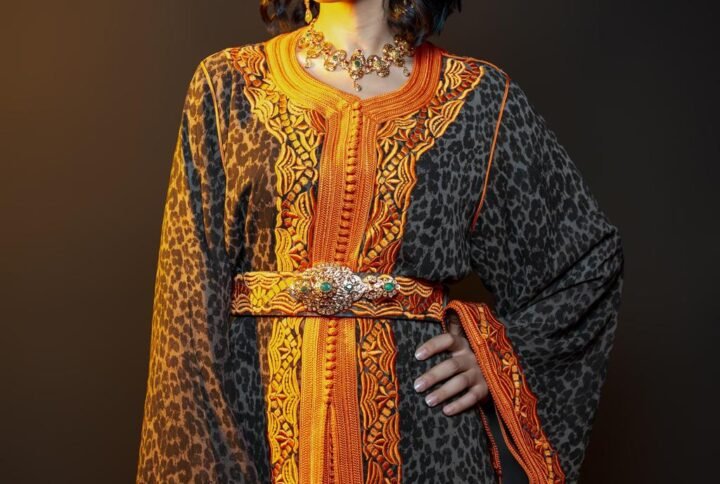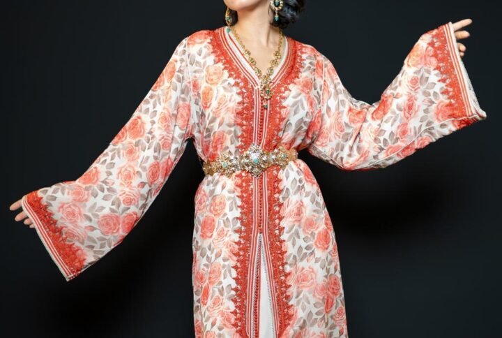 Un caftan somptueux en velours violet profond, rehaussé de broderies argentées délicates et d’une ceinture ton sur ton — symbole d’élégance et de prestance signée Maison Salima.