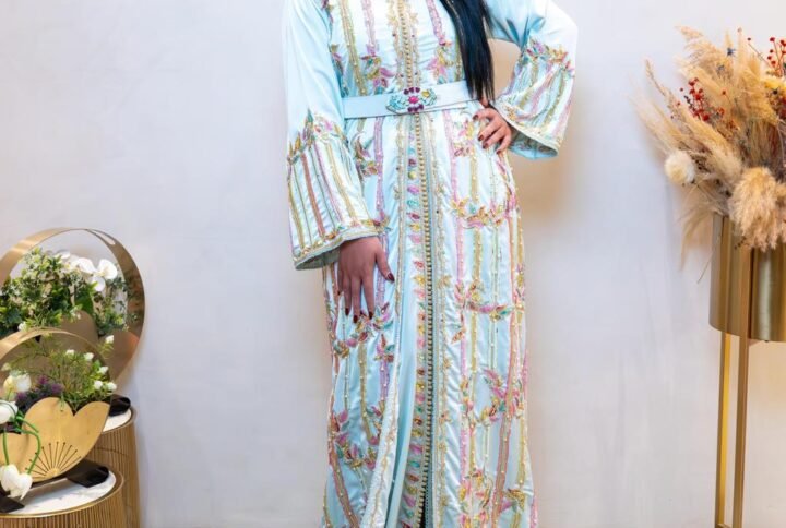 Ce caftan crème séduit par l’alliance harmonieuse entre modernité et tradition. Ses broderies géométriques et florales bleu royal sont rehaussées de détails dorés et de perles brillantes, créant un jeu de lumière raffiné.