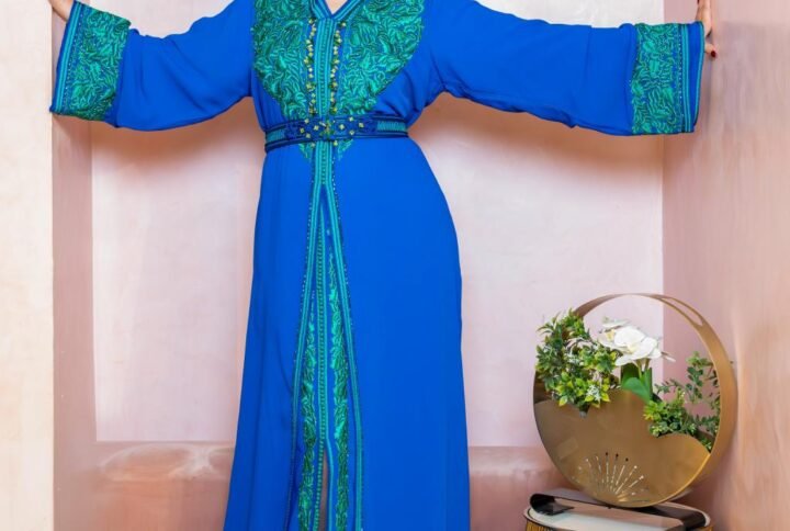 Ce caftan noir incarne la sophistication discrète grâce à ses broderies minutieuses et son perlage noir sur noir, qui lui confèrent profondeur et raffinement.