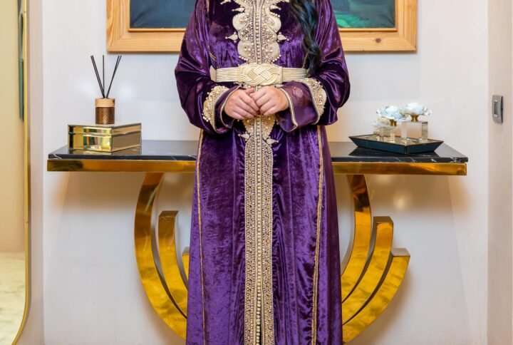 Les manches longues et fluides renforcent le côté majestueux de la tenue, tandis que la ceinture noire large vient souligner la taille pour une silhouette structurée et moderne. Ce caftan est le choix parfait pour celles qui veulent allier audace, distinction et modernité.